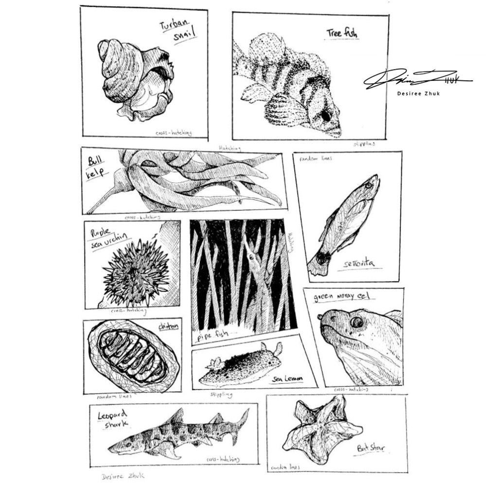Hello, my name is Desiree Zhuk and I am a masters student at San Francisco State University, under the Hines Lab. With a hope for future reintroduction of a key species, I am studying the prey accessibility of Southern sea otters in low anthropogenic risk areas within San Francisco Bay. Outside of my research and studies, I use illustration to inspire others for the care of our oceans.