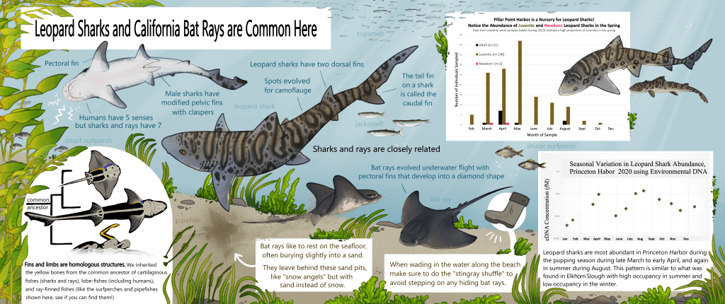 I have been recently working with The Marine Mammal Center on their “Meet The Whales” webpage as well as working with some of their animal behavior scientists on some scientific illustrations for their work that is to be published soon. There is also a physical interpretive sign that I have collaborated on with SFSU’s icthyology lab on leopard shark and bat ray research in Half Moon Bay, the sign itself is currently in production. I have previously worked with MISS Elasmo on scientific illustrations and educational course material for middleschoolers, highschoolers, and family groups, as part of the Gill Guardians program. I have also worked with the Marine Science Institute in Redwood City as a marine biology instructor and have volunteered at multiple institutions such as Monterey Bay Aquarium, Long Marine Lab, and Bodega Bay Marine Labs, often providing illustrations on top of my usual duties.